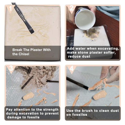 Dinosaur excavation tool is not only a toy for cultivating children's brain-handling ability, but also a way to study ancient culture. It is also a toy for parents and children to play games and enhance their feelings. <br> 1. Break out the clod and tools from the box,put them on the big paper or bag, use the dig tools to start digging,at the same time,use the brush to clean the clod. By the way, you can spray water while digging.</br><br> <br>2. When you see the skeletons of dinosaur,please excavate carefully and patiently,in order to avoid the damage,please clean the covered placer out before digging up the skeleton. </br><br> 3. Use the brush to clean down the remnant land plaster. </br><br> 4. Splicing the dinosaur fossil fragments</br>